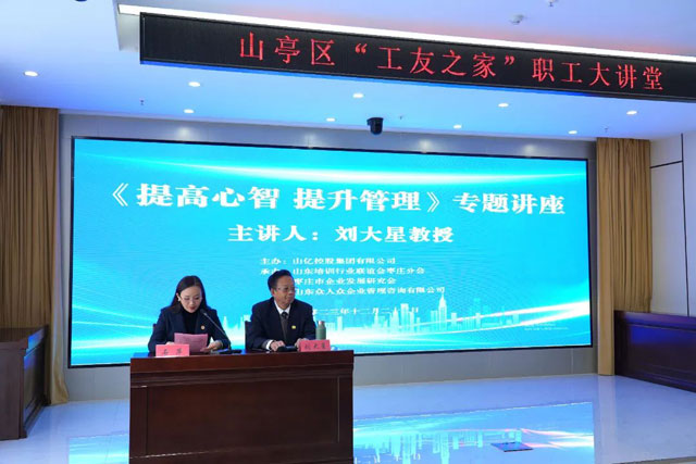 12月22日,由棗莊市企業(yè)發(fā)展研究會(huì)和山東眾人眾企業(yè)管理咨詢有限公司共同組織的《提高心智 提升管理》專題講座在棗莊市山亭區(qū)“工友之家”職工大講堂開講。開講前舉行了棗莊市山亭區(qū)“工友之家”揭牌儀式。棗莊市總工會(huì)黨組成員、女職委主任周琴,山亭區(qū)人大常委會(huì)副主任、區(qū)總工會(huì)主席張成國,山億集團(tuán)黨總支書記、董事長張兆寶出席活動(dòng),區(qū)總工會(huì)黨組書記、常務(wù)副主席侯化成出席并主持揭牌儀式。