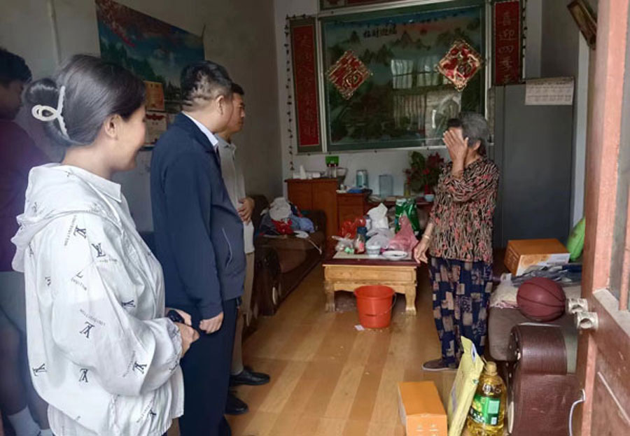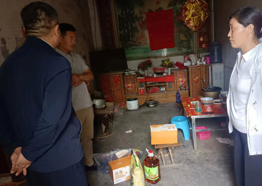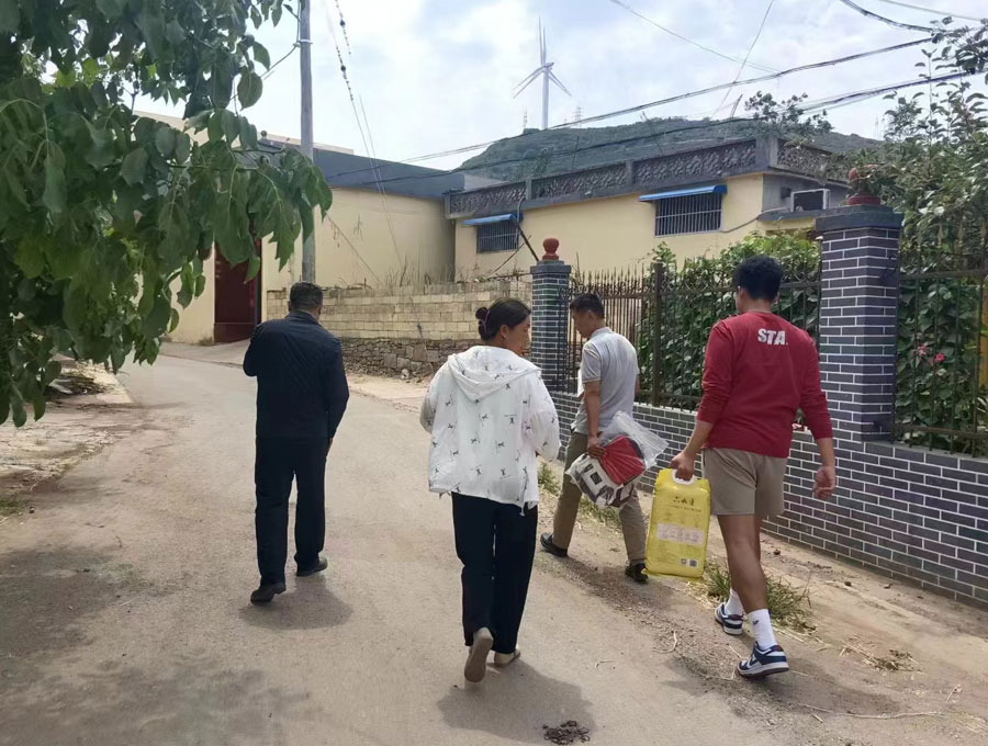 山亭區(qū)山城街道沙河頭村第一書記張龍和愛心企業(yè)家皇家玉嬰總經(jīng)理田汝金一行看望兒童。為他們帶來了,書包,米油食品等。
