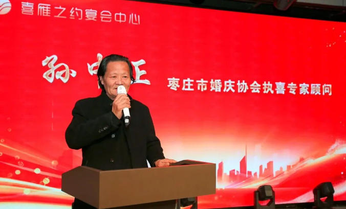 棗莊市新聯(lián)會(huì)書畫院院長(zhǎng)、棗莊市婚慶協(xié)會(huì)執(zhí)喜專家顧問(wèn)孫中正作為執(zhí)喜代表發(fā)言。他從行業(yè)專業(yè)視角出發(fā),對(duì)喜雁之約宴會(huì)中心一年來(lái)的跨越式發(fā)展給予高度評(píng)價(jià),盛贊其在提升區(qū)域宴會(huì)服務(wù)品質(zhì)、引領(lǐng)行業(yè)發(fā)展潮流方面的積極作用與突出貢獻(xiàn)。