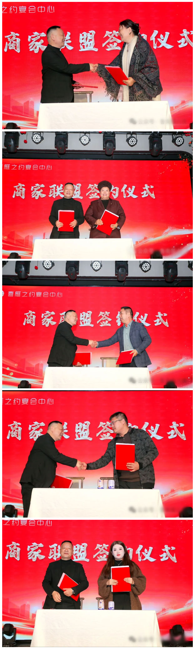 發(fā)布會(huì)現(xiàn)場(chǎng)亮點(diǎn)紛呈,一場(chǎng)隆重的合作簽約儀式備受矚目。喜雁之約宴會(huì)中心與銀河珠寶、蘇菲瑪索婚紗攝影、報(bào)喜鳥(niǎo)男裝、露露飲料、開(kāi)元曼居酒店等本地優(yōu)質(zhì)異業(yè)商家企業(yè)正式簽署合作協(xié)議,雙方代表握手合影,定格下互利共贏的重要時(shí)刻。此次跨界聯(lián)盟,旨在整合各方核心優(yōu)勢(shì)資源,構(gòu)建覆蓋宴會(huì)全鏈條的服務(wù)生態(tài),為消費(fèi)者提供更全面、更便捷、更優(yōu)質(zhì)的一站式解決方案,開(kāi)啟行業(yè)協(xié)同發(fā)展的嶄新篇章。
