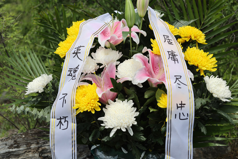 志愿者將準(zhǔn)備好的花籃擺放在一塊山石前,花籃中插滿菊花和百合花,鮮花映襯下的挽聯(lián)分別書寫“居庸盡忠”和“英魂不朽”。楊思忠的后人則將山東老家的糕點(diǎn)、白酒、香煙等擺放在花籃前。布置完成的祭臺(tái)看上去雖略顯簡(jiǎn)易,但由于是在戰(zhàn)地遺址上,反而更顯莊重。此刻,楊茂松已無(wú)法壓抑情緒,他撇下拐杖,緩步走向祭臺(tái),雙膝跪地,兩手合十,瞬間淚如泉涌。