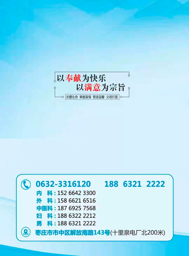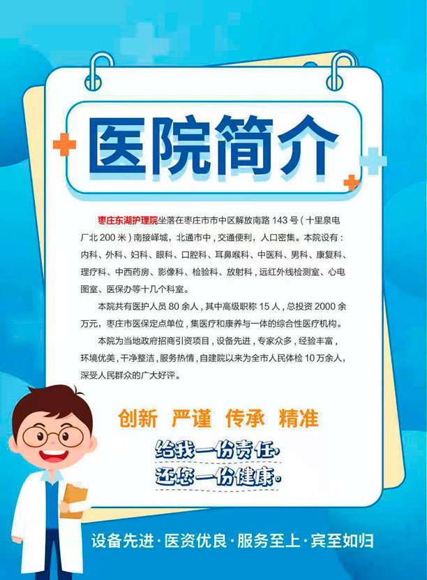 本院共有醫(yī)護人員80余人,其中高級職稱15人,總投資2000余萬元,棗莊市醫(yī)保定點單位,集醫(yī)療和康養(yǎng)與一體的綜合性醫(yī)療機構(gòu)。
