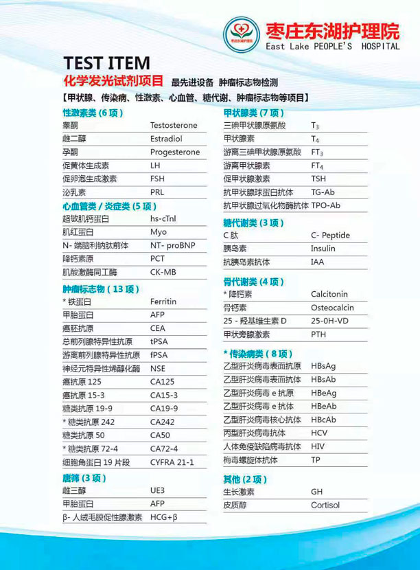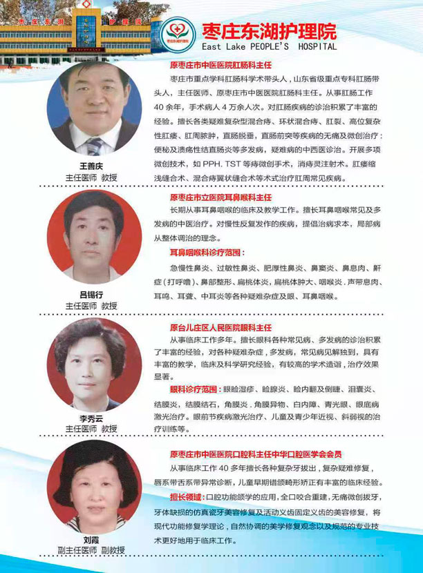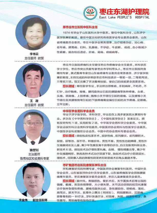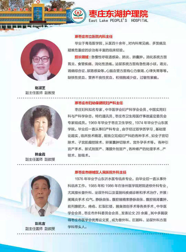 棗莊東湖護理院坐落在棗莊市市中區(qū)解放南路143號(十里泉電廠北200米)南接嶧城,北通市中,交通便利,人口密集。本院設(shè)有:內(nèi)科、外科、婦科、眼科、口腔科、耳鼻喉科、中醫(yī)科、男科、康復(fù)科、理療科、中西藥房、影像科、檢驗科、放射科,遠紅外線檢測室、心電圖室、醫(yī)保辦等十幾個科室。